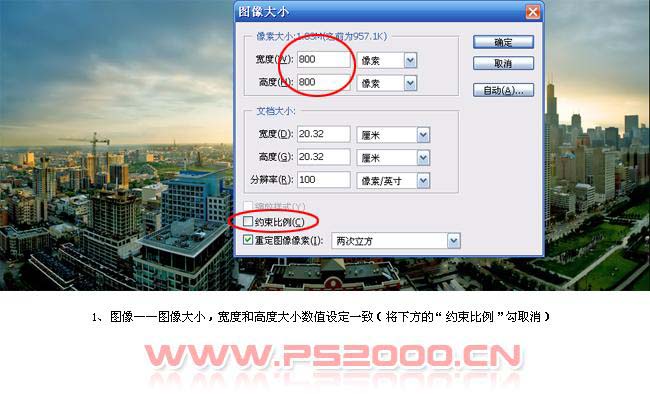 | 1、打开原图素材,选择菜单:图像 > 图像大小,把宽度和高度数值设定为一致,设定之前先把约束比例取消勾选。 |