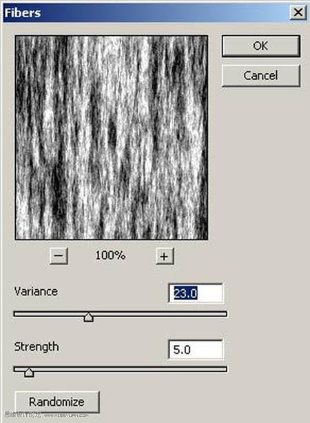 | 3、选择滤镜/渲染/纤维,设置差异为23,强度为5,确定后按Ctrl+D取消选区。 |