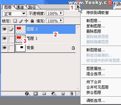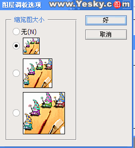 图1中显示出了图层面板最简单的功能,1是图层的菜单功能,点击向右的菜单就可以看到它的功能,包括:新建、复制、删除图层,建立图层组,图层属性,混合选项,图层合并等等功能。2就是图层,3是可以看到图层上图像的缩略图。 在Photoshop中在“窗口”菜单下选择“图层”就可以打开上面的面板,如果想改变图1中3缩略图的大小可以,点击1的三角形按钮展开功能菜单选择“调板选项”打开选择对话框(图2),然后设置缩略图的显示大小了。 |