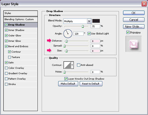 5、双击文字层,应用以下样式:阴影: 改变距离和大小8像素。 |