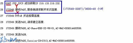 还有一种断线日志为“接受PADT,服务端请求断开本次连接”,如图7。路由器的每条系统日志由一个编号和内容组成,内容的前部数字为路由器开机后运行的时间参数,单位为秒(s),可先后记录接受PADT的时间为X,此日志前面的最相近的显示成功获取IP的日志的时间为Y,(X-Y)/3600即得出多长时间断线。一般情况下看到的现象是24(86400s)或48(172800s)小时会自动断线,然后自动拨号,如图7的用户分别在86400,172800,这种情况是由于ISP会在一个帐号认证了24或48小时后获取的动态IP的地址租期达到了设定的时间,因此会收回原有IP资源,再重新分配的过程,属于正常的行为,使用路由器的情况下只要设置连接模式为“自动连接”即可。