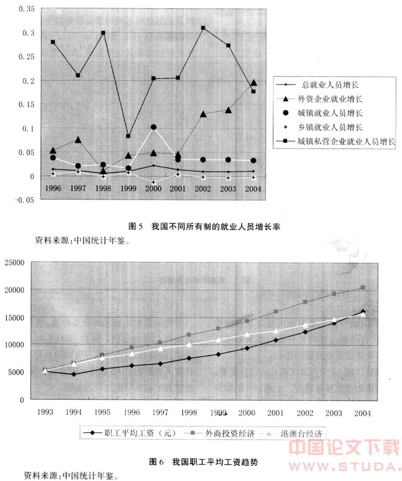 (1)对劳动力的吸引。廉价的劳动是决定我国国际贸易模式和外资进入我国的重要因素之一。因此,我国扩大劳动密集型产品的出口和吸引大量外资提供的新的就业机会,总体上说是有利于劳动就业的增加,有利于农业劳动向非农业劳动的转移,从而有利于增加φ′W比重的。1996年以来,我国吸引劳动力就业增长率最快的是民营企业和外资企业,而且外资企业对劳动力的吸引持续上升(见图5)。所以,在加快我国农业劳动向非农劳动的转移过程中,国际贸易和引进外资发挥了重要的作用,有利于增加φ′W。