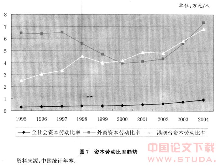 (3)技术进步倾向。对在我国的外资企业资本劳动比率的比较和趋势分析显示,无论是外资企业还是港澳台企业的资本劳动比率都明显高于本土企业的平均水平(见图7),而且近期有上升的趋势。外资和港澳台企业使用的是属于倾向资本的技术进步。在劳动力工资上升的趋势中,厂商为了获得或保持更高的盈利,这种资本深化的趋势是必然的。但是这种技术进步倾向比本土企业倾向劳动的技术进步,吸收劳动力的效率要低一些。所以在技术进步倾向上,外资企业对φ′W值增加的贡献要低于本土企业。