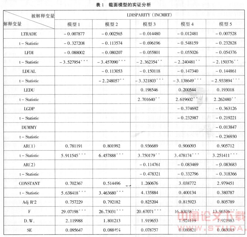 其余的控制变量包括DUAL、EDU、GDP、DUMMY。DUAL表示二元对比系数。二元对比系数表示二元经济中,农业和非农业的相对劳动生产率的比率,反映了经济的二元化程度。二元对比系数越小,表明两部门的差别越大,即二元性越大,反之则越小。DUAL的系数如果是负的,即二元对比系数越大(二元化程度越低),则城乡居民收入差距越小。EDU表示教育的发展水平。EDU用国家财政性教育经费占GDP的比重表示。如果EDU的系数为负,则说明科教兴国战略除了众所周知对经济增长的作用,同时有助于缩小我国收入差距。 GDP表示国内生产总值的增长率。如果GDP的系数为正,则说明,随着经济发展速度的增加,居民的收入差距扩大。反之则说明经济的快速增长有利于缩小收入差距。DUMMY为虚拟变量,为了区别沿海省份和内陆省份。沿海省份DUMMY=1,内陆省份DUMMY=0。如果模型的检验结果中, DUMMY的系数为负,则说明沿海省份的城乡收入差距小于内陆省份,否则则说明内陆的省份的城乡收入差距小于沿海省份。为了减少模型的误差项之间存在的异方差性,在下文的实证分析中采用上述变量(除虚拟变量DUMMY)的自然对数形式,用 L表示LOG,即LDISPARITY、LTRADE、LFDI、LDUAL、LEDU1、LEDU2、LGDP。