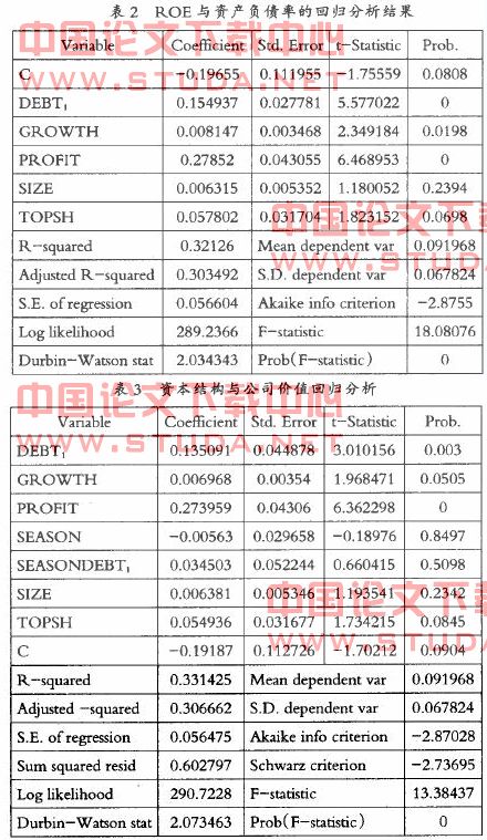 由表1统计缮果可以看出,公司的平均净资产收益率为10%,标准差为7%,说明行业整体净资产收益率分化较小;资产负债率为54%,标准差为15%,这表明房地产行业资产负债率非常高,且行业内部分化明显;净利润率均值为12%,最高达60%,标准差为10%,说明行业内部分化明显;公司成长度均值为45%,标准差为1.19,这说明房地产行业发展迅速,但行业内公司差异明显。股权集中度为56%,说明房地产行业大股东持股比例较高,行业内部差异不大。资本结构与公司价值回归结果分析(见表2、表3)。