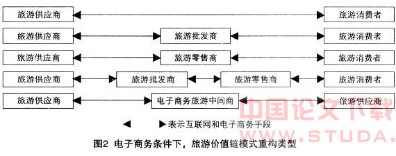 根据产业价值链的概念,我们可以把旅游价值链定义为旅游产品从供应到最终消费的一系列传递的过程,它一般由旅游产品供应商、传统旅游中间商或电子商务旅游中间商以及旅游消费者组成。传统旅游中间商一般包括旅游产品批发商和旅游产品零售商。旅游价值链传递的过程也就是旅游产品被不断增值的过程。在这一条价值链中,不同层次的旅游企业通过其职能分化和专业优势为旅游产品注入价值,最终使旅游产品得以实现。不同的旅游产品供应商为旅游者提供了不同的个别产品,实际上属于旅游产品的中间产品。旅游中间产品经过旅游中间商的组合包装后形成旅游最终产品并传递给旅游消费者。在旅游中间商中,传统旅游批发商不仅为旅游产品进行整合与包装,还注入了接待与导游服务,而传统旅游零售商则提供了咨询与代理服务。电子商务条件下,旅游价值链又出现了新的成员——电子商务旅游中间商。