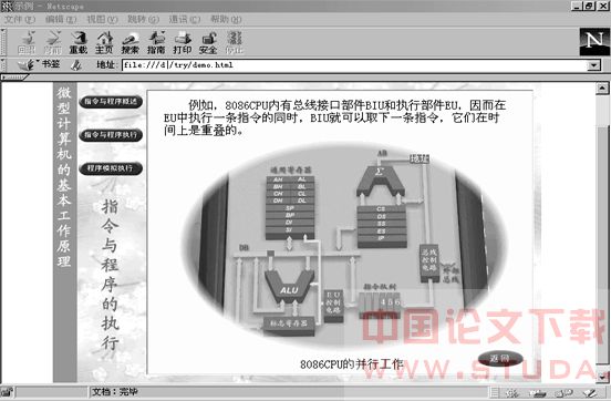 最后,进行客户端浏览器的设置:先根据需要下载Shockwave for Authorware的安装程序NP32ASW.EXE(32位)或NP16ASW.EXE(16位),然后进行插件的安装,并选择浏览器类型(Navigator或IE)之后,浏览器就能播放处理过的Authorware程序了。如图2所示,即为课件在Netscape Communicator 4中播放的情况。