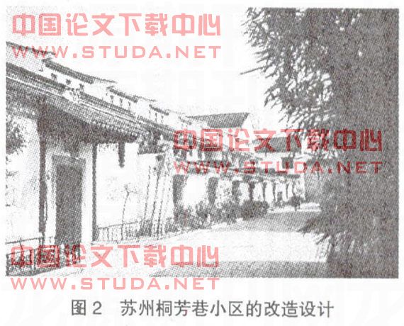苏州桐芳巷小区的改造设计(图2)具有典型的地方特色和语汇。如传统的建筑形式与细节,并不是完全的仿古建筑,但坡屋顶、白粉墙、花窗、庭院、风火墙等,都带有明显的传统文化印记的符号。这是一种“有形”的景观视觉控制。除了建筑风貌的重塑,还有哪些保持城市传统街区的完整记忆、增强城市的特色及个性的规划思路呢?桐芳巷保留了原有的街区格局与空间尺度。在建造新建筑的同时力求延续原有的空间氛围,使居民有乡情可寻。内向围合的总体布局不仅仅体现在每一个院落中,整个街坊的4个沿街面布置较高的商业公建,而在内核布置居民住宅,形成大街繁华、小巷幽静的氛围。邻里空间、内向围合、树木、墙等都是景观空间设计的元素。