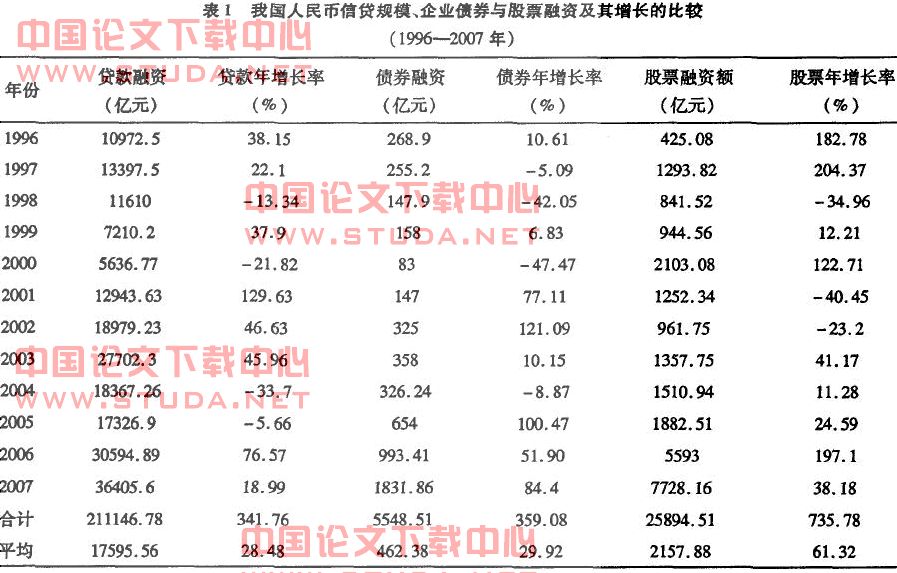1.我国企业外部融资以贷款融资为主,占据绝对优势。由表2得出,1996-2007年这12年的数据显示,银行信贷所占的比重是87%,是股票融资和债券融资合计的6.7倍。