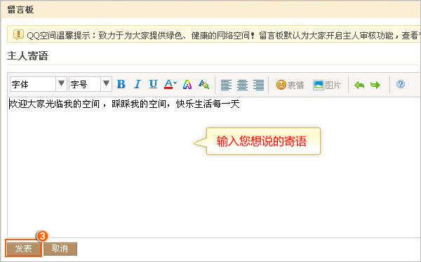 温馨提示:QQ空间留言板主人寄语最多输入约1000个汉字,在编辑时汉字加有其它效果可能会影响输入字数的多少,例如:汉字添加了超链接、发光字体等。