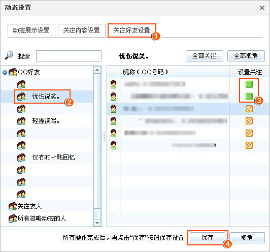 选择‘关注内容设置’,可以自定义选择您想关注好友空间的类别前打上勾,最后“确定”即可。