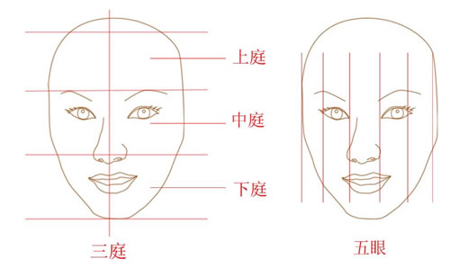 “三庭”即,发际线到两个眉梢之间的虚拟线为一庭;眉梢线到鼻尖虚拟线为一庭;鼻尖线到下颚为一庭,这几条线间的距离大致是相等的,我们常称这几条线中间的部分为“三庭”。