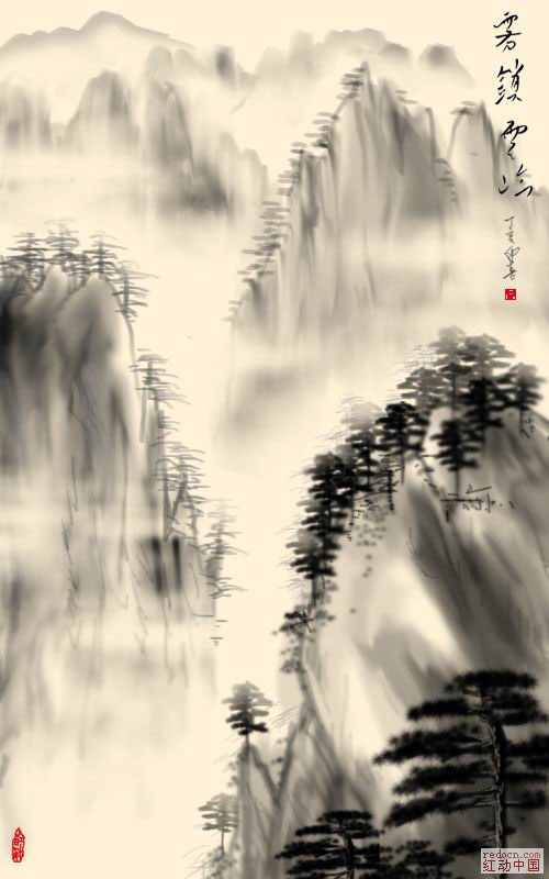 本教程的过程介绍有点简单,鼠绘的时候可能会复杂很多。山峰、树木、云雾等都需要先自己设置好笔刷后再慢慢绘制。 最终效果 |