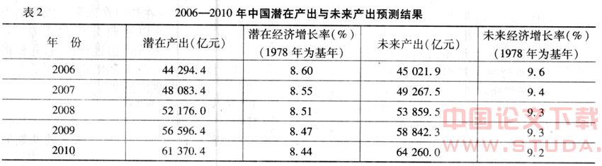 运用方程(3)对我国2006-2010年潜在产出进行预测,然后进一步计算2006-2010年我国潜在经济增长率,预测结果见表2。
