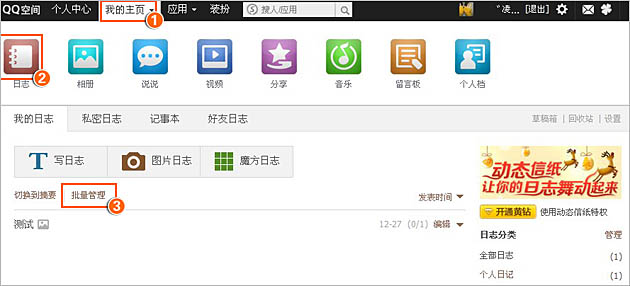 第一步:登录您的QQ空间,在导航条点击‘我的主页’选择‘日志’,进入日志页面选择‘批量管理’;