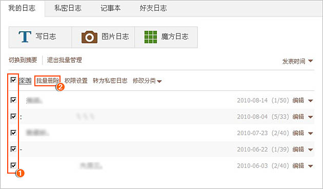 第二步:选择需要进行管理的日志进行操作(批量删除、权限设置、转到私密记事本、修改分类)后保存即可。